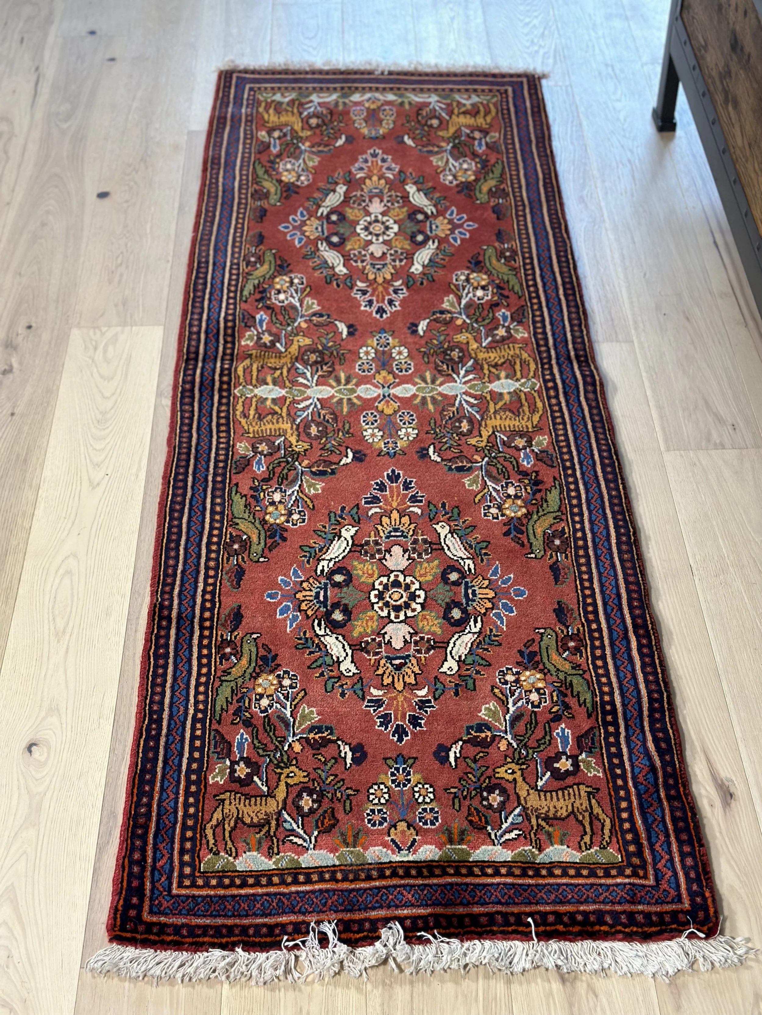 Step into a tale as old as time with this meticulously crafted Persian-style rug, featuring a captivating floral hunt scene. Sized at 85x28 inches, this rug showcases vibrant tones of red and blue, intertwined with detailed depictions of animals and floral motifs that bring each hunt scene to life. The intricate design and bold colors make it a statement piece that is sure to spark conversations.